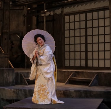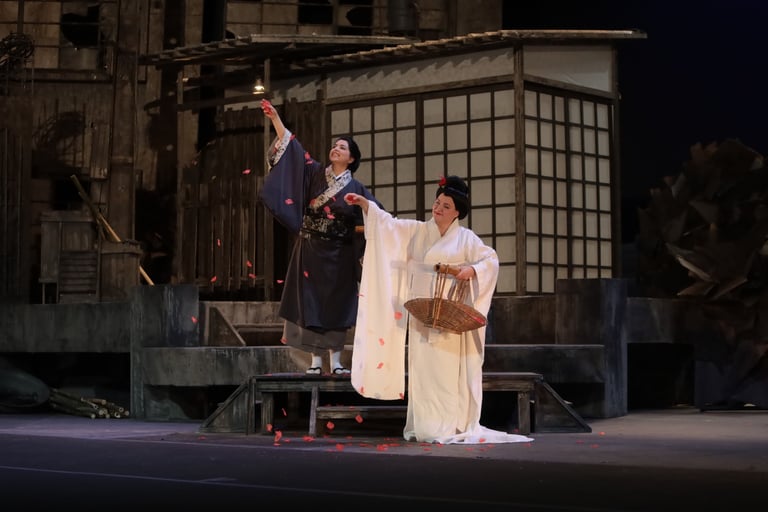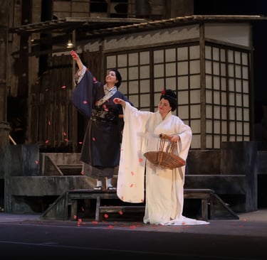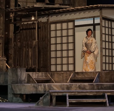 Na versão 2025 de Madama Butterfly, além da ambientação ser narrada nos anos 50, o que coincide com o fim da Segunda Guerra Mundial, na qual, o Japão foi bombardeado pelos E.U.A, inclusive pela primeira vez na história da humanidade foi usada a “Bomba Atômica”, que caiu nas cidades de Hiroshima e Nagasaki, Eiko correlaciona como a direção cênica equilibra a beleza melódica de Puccini com toda a carga dramática e social do Japão do pós-guerra, especialmente em relação à presença militar americana.