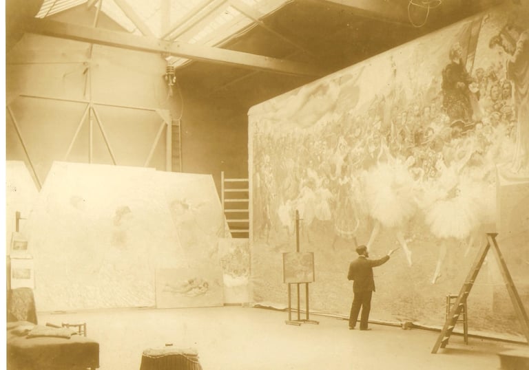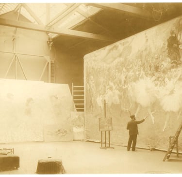 (Eliseu Visconti em seu ateliê, na comuna de Neuilly-sur-Seine, executando parte central do Pano de Boca, 1907. Acervo CEDOC/FTMRJ).